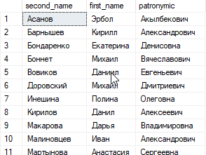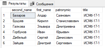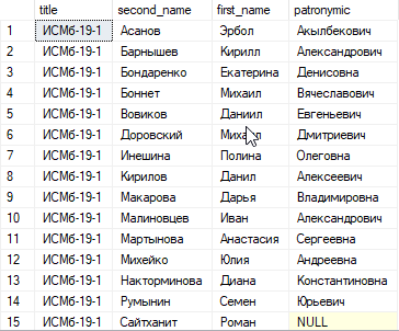 Узнать идентификатор группы ИСМБ-19 и вывести список студентов, которые учатся в этой группе упорядоченные по фамилии с указанными набором столбцов: